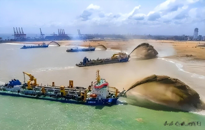 这些船搭载的绞刀功率高达4200千瓦,能将海底岩石搅碎,混合海水通过管道喷射至目标区域填岛,省去千里运沙的麻烦,效率高、成本低,同时采用管道圈围技术,防止泥沙流失、抵御风浪,吹填的岛屿均为永久性工程。