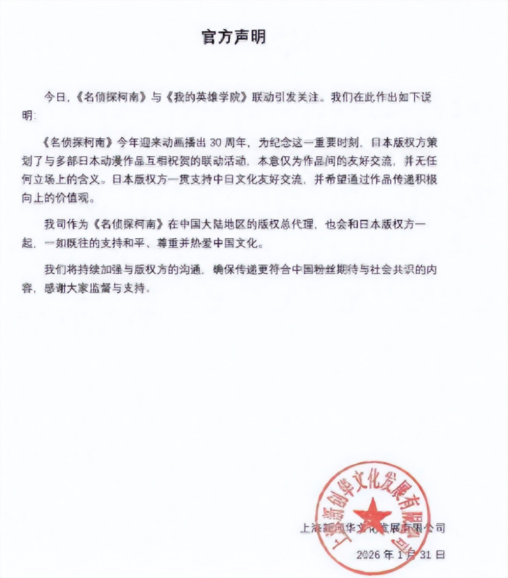 此外,另外一个在国内很火的日本动漫IP“柯南”也因为损害中国利益而迅速登上热搜。据悉,《名侦探柯南》30周年纪念活动选择与《我的英雄学院》的联动,对此柯南官方辩称是“作品友好交流”。