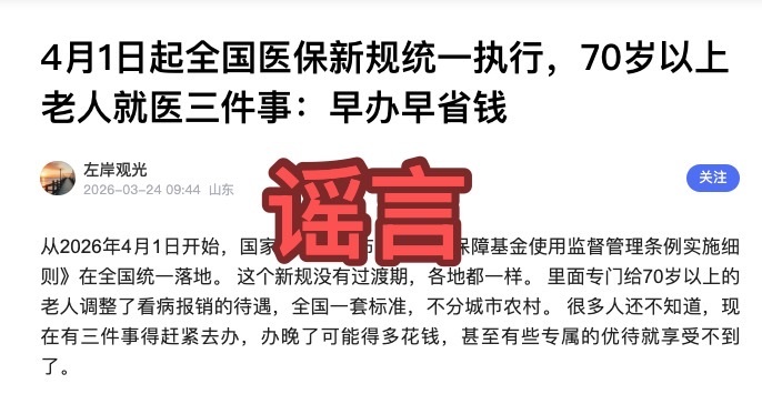 近日,收罗上有渊博自媒体发文说,从2026年4月1日运行,医保新规在宇宙和解落地,70岁以上的老东谈主看病报销的待遇有调节。部分著作的标题称“4月1日起70岁以上老东谈主就医新规落地,不办三件事就白扔血汗钱”。