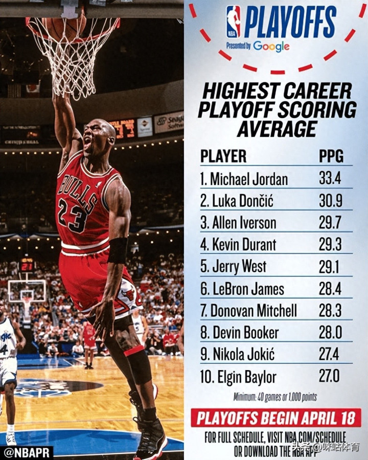 nba下注官网 历史季后赛场均得分TOP10! 东契奇紧随乔丹