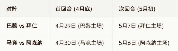 2025-26赛季欧冠四强已尘埃落定,拜仁慕尼黑、巴黎圣日耳曼、阿森纳、马德里竞技捉对格杀。半决赛首回合将于下周开打,这不仅是技政策的博弈,更是心态与赛程的终极考研。