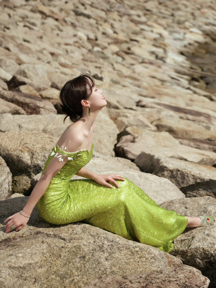 这组写照最出彩的是采选在了海的边际,海岸处到处齐是石头,还有那像岛屿似的小岛,蓝盈莹在这么的布景下拍摄写照,果真与她的鱼尾连衣裙相等相搭。