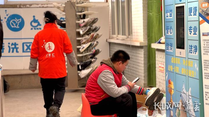 残疾东谈主在“点爱精洗”洗鞋技俩现场使命。