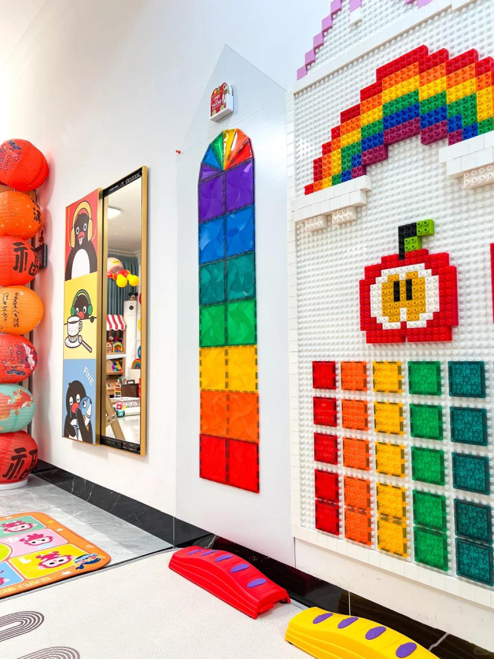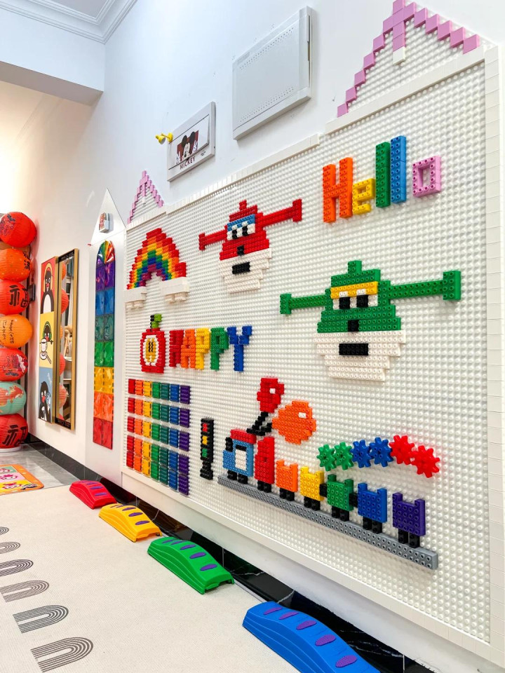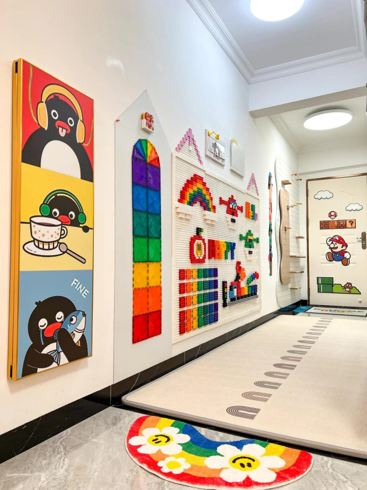 左边墙分了三块。靠门口的场所是磁力墙,孩子可以拿磁力片拼东西。中间是一大块乐高墙,乐高底座径直钉在墙上,孩子站着就能玩。