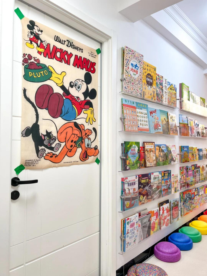 右边墙全部放了绘本。装了十个透明的亚克力绘本架,每个不大,刚好能把书的封面朝外摆。孩子一眼就能看到哪本书上有可爱的图案,我方伸手就能拿,无须叫大东说念主。