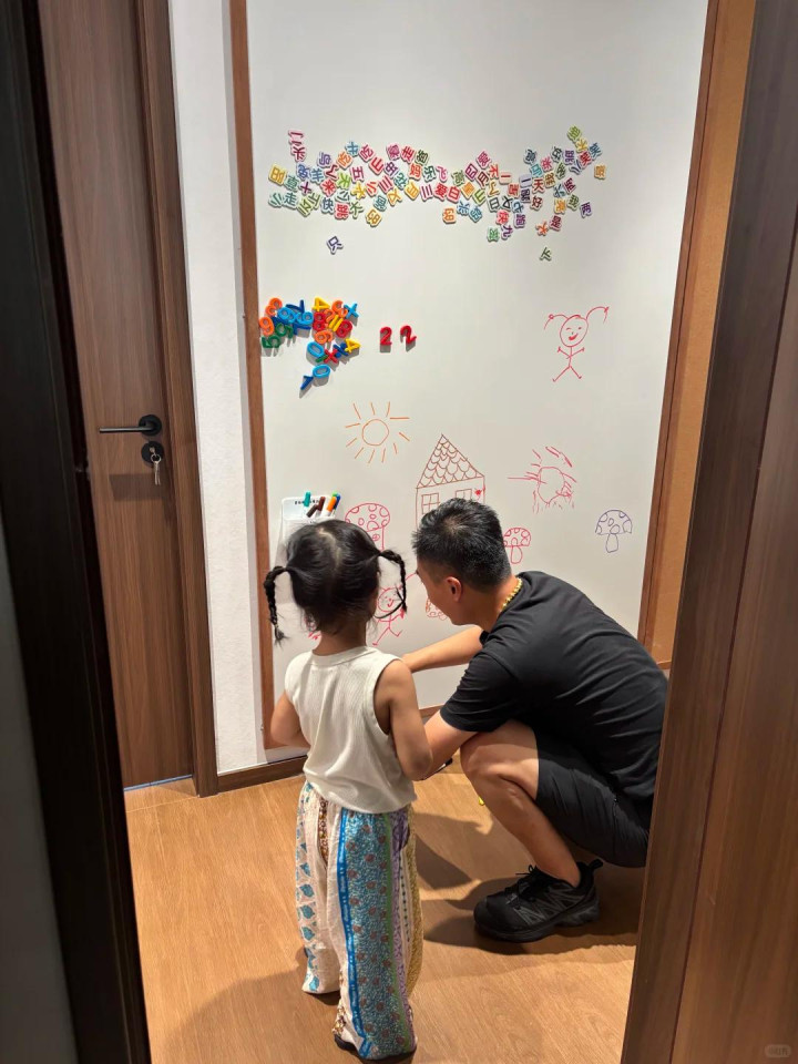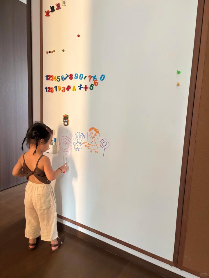 改完之后,这面墙就成了孩子专门画画的场所。想画就画,画完擦掉再画,家里别的墙再也莫得被画过。既保住了家里的墙,又让孩子画得惬心。