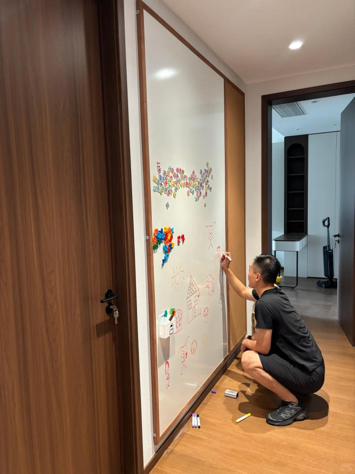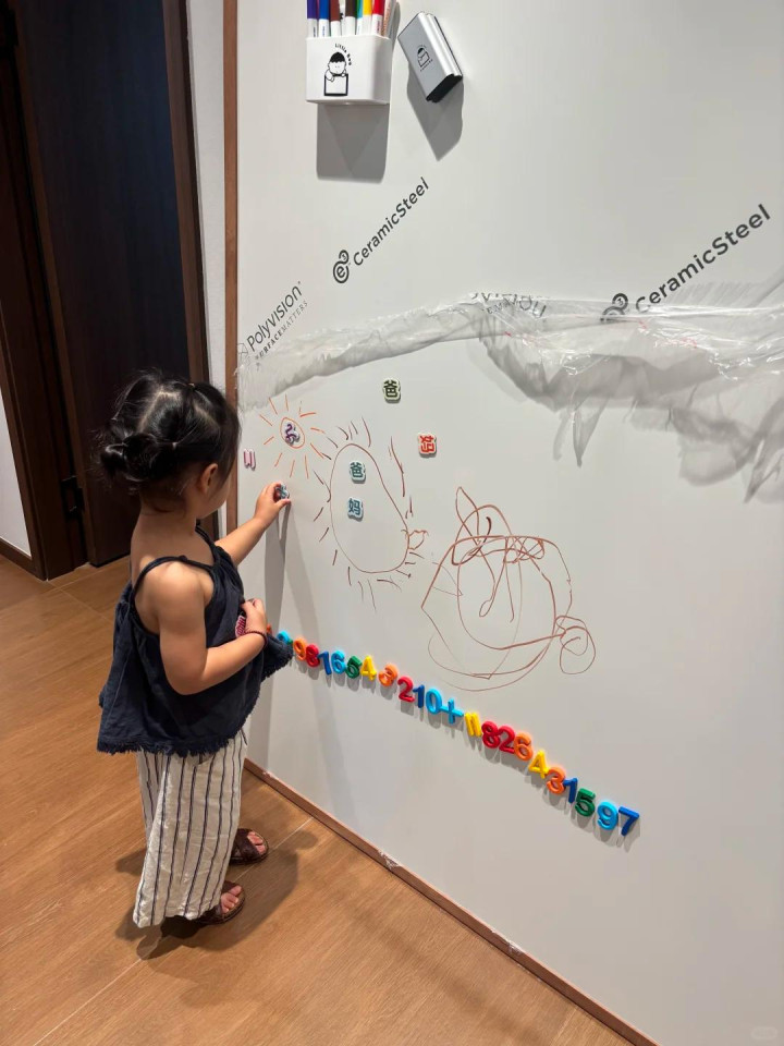 这家有一面大白墙,一直空着。孩子可爱到处画,家里别的墙也曾被彩笔画了好几次了。她想过装白板,但以为白板不面子,况兼用深切会花。其后看了一圈,终末选了哑光的搪瓷板。