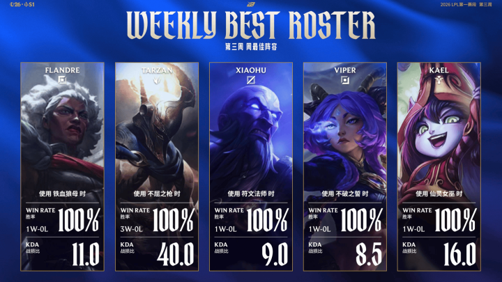 nba下注 LPL第三周最佳阵容: Flandre/Tarzan/Xiaohu/Viper/Kael