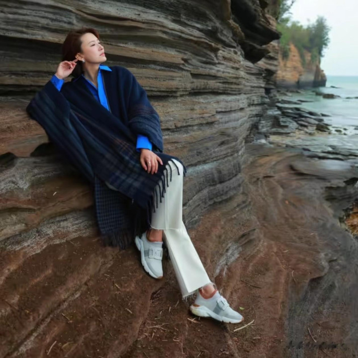 衬衫的外层披了一件玄色的流苏披肩,不是那种薄薄的纱巾,是有点厚度的毛呢材质,摸上去应该软乎乎的。披肩的主体是纯玄色的,围聚下摆的位置有几说念深灰色的横条纹,不是很明慧的那种,是低调的档次,下摆垂着长长的玄色流苏,不会让造型显得太幽闲。