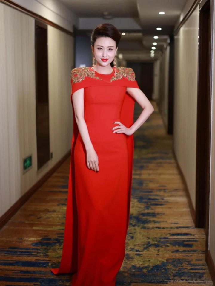 身上这件礼裙的感情是那种很正的中国红,不是发粉发暗的那种,亮得很有气场,就像把一团火焰穿在了身上。领口是圆领的贪图,刚好卡在锁骨下方,不会太裸露,也不会显得保守,把肩颈线条衬得又直又长。