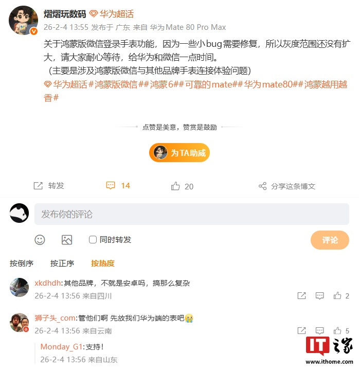 IT之家2月4日消息,博主@熠熠玩数码今日发文解答了关于鸿蒙版微信登录手表功能的相关问题,他表示因为一些小Bug需要修复,所以灰度范围还没有扩大,主要是涉及鸿蒙版微信与其他品牌手表连接体验问题。