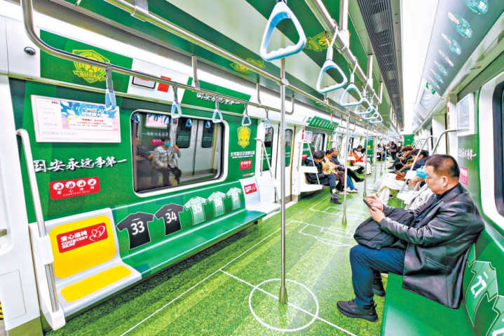 除了主题车站,北京地铁还在3号线打造了一各国安球员主题列车,成为不雅赛球迷的“移动绿茵主场”。