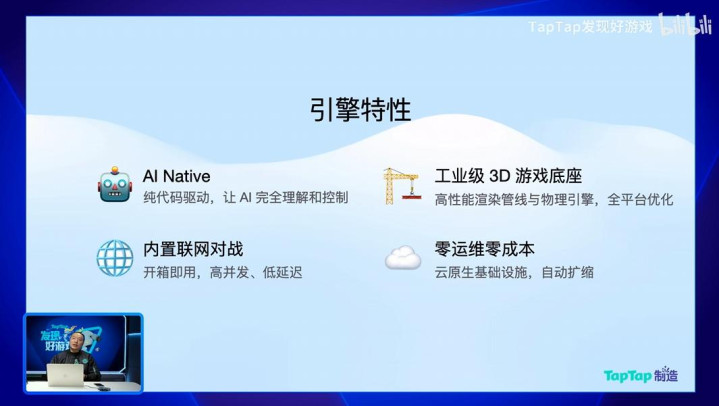 但是今天因为有了AI,有了智能体,所有接入都是对大家来说都是不需要关心。我们已经教会了智能体如何接入这些TapTap服务,以至于当游戏上线的时候,这些服务都能够非常天然自然集成,不会给到我们创作者带来任何的障碍。