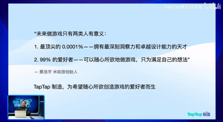 我想说的是,「TapTap制造」这个产品就是为了那99%想随心所欲创造游戏的游戏爱好者而生的。