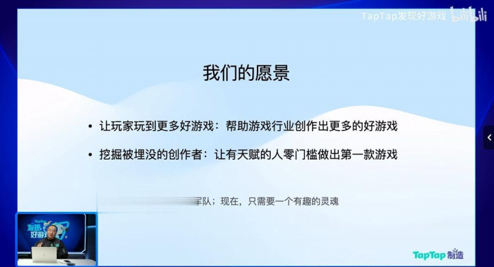 我们今天不只是帮助玩家发现好游戏,还要帮助玩家玩到更多的好游戏,通过帮助游戏行业创作更多的好游戏来实现这个目标,同时还希望能够挖掘更多被埋没的创作者,让有游戏天赋的人零门槛地做出他的第一款游戏。
