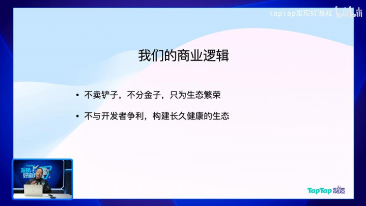 就像TapTap10年来的目标一样,我们一直是希望不与开发者争利,希望跟开发者跟玩家都能够站在一起,去构建一个长期可持续成长的生态,这就是我今天想要介绍的大部分内容。