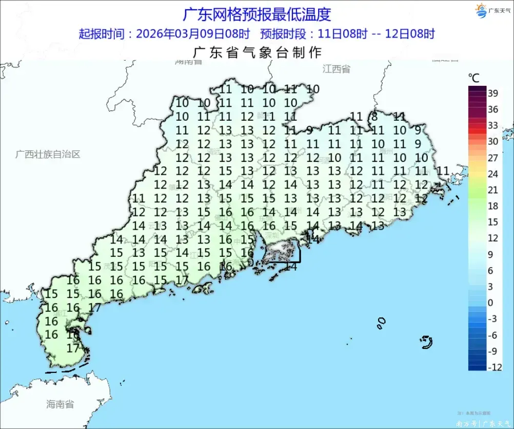 11日,粤西市县阴天到多云,夙夜有轻雾,其余市县晴到多云。最低气温:粤北、珠三角北部和粤东市县9~12℃,雷州半岛16~20℃,其余大部分市县12~16℃。