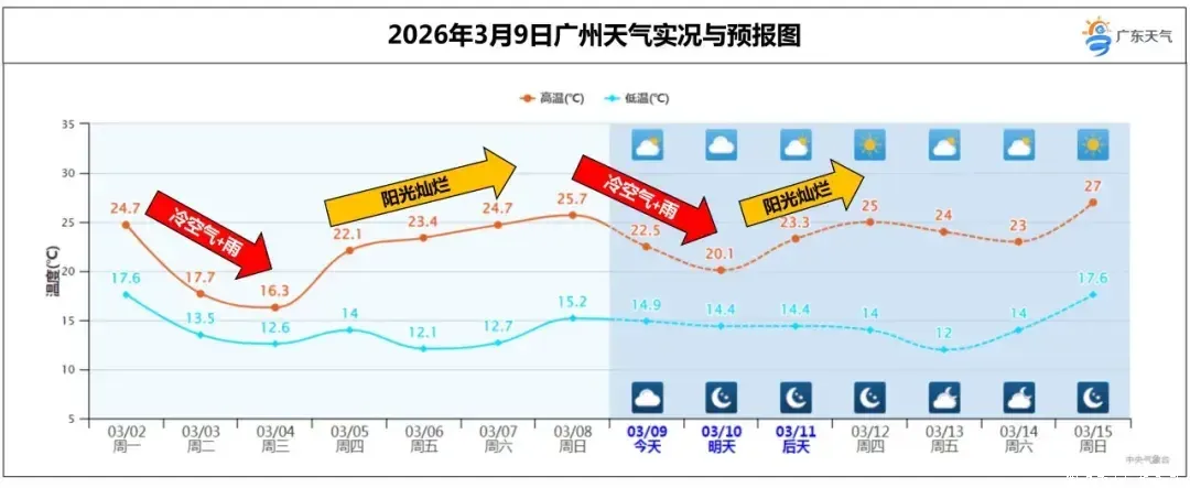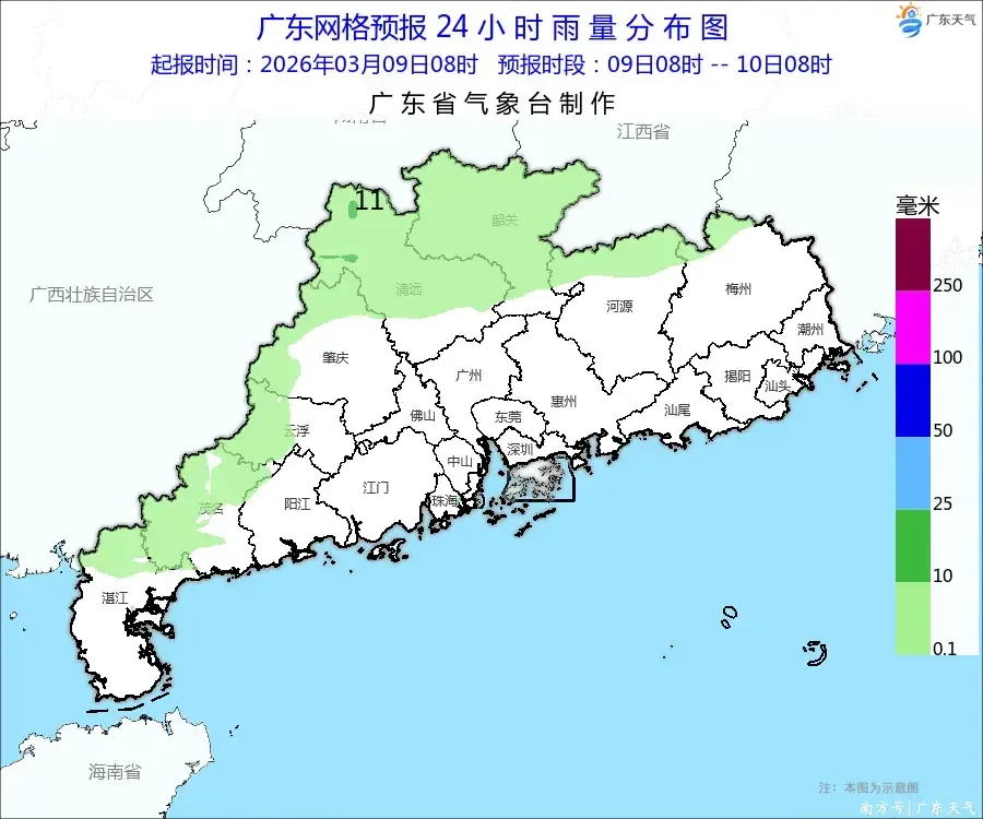 具体来看,今天(9日)白昼到夜间,清远、韶关阴天,有小雨,珠三角、粤西市县阴天,有分布小雨,其余市县多云为主,局部有小雨。
