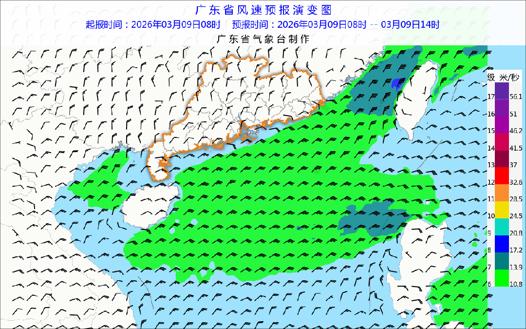 冷空气吹到海上也会带来大风天气,9-11日清早,广东沿海海面东北风6~7级阵风8级;12日起,海面风力自东向西再行加大至6~8级。