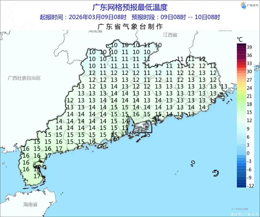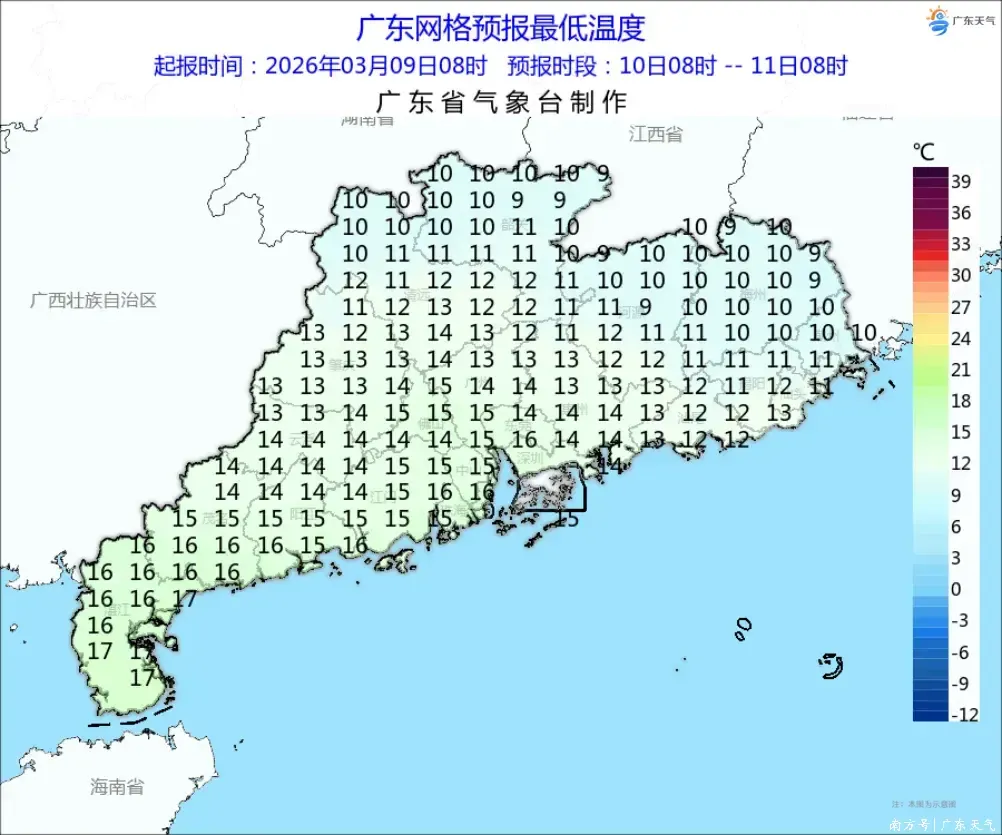 10日,中南部市县分布稀罕小雨转阴天,其余市县多云间阴天。最低气温:粤北、珠三角北部市县9~13℃,雷州半岛17~20℃,其余大部分市县13~17℃。