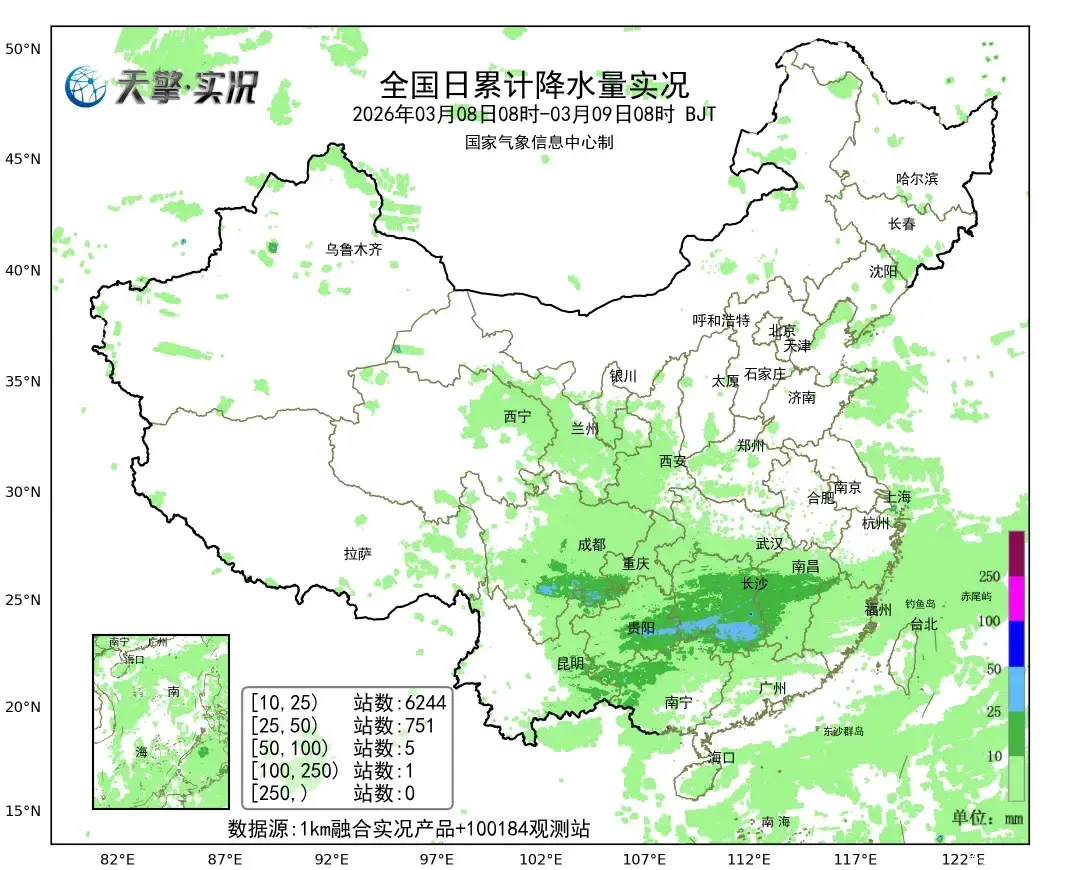8昼夜间到9日清早,受高空槽影响,我国西南地区东部、江南大部、广西北部降雨平时,四川东南部、贵州东南部、湖南南部等地部分地区出现大雨,局地暴雨。